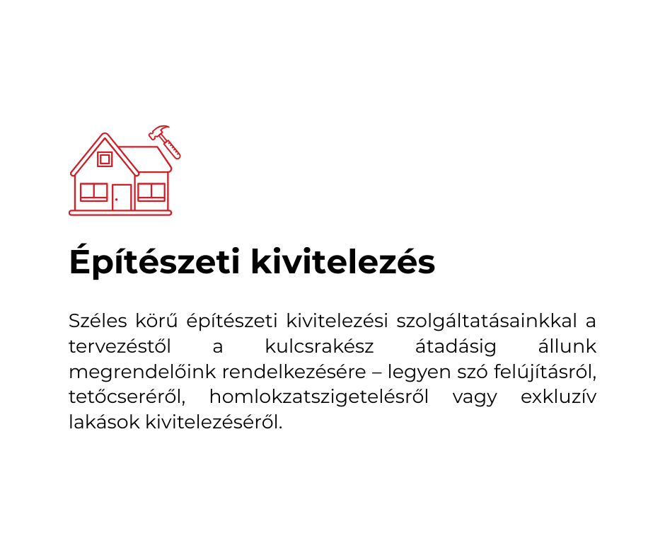 Szolgáltatásaink az építészet minden területére kiterjednek: a tanácsadástól és tervezéstől, a pénzügyi megoldások keresésén át, az építkezés és felújítás minden folyamatát egy kézben tartjuk. Több éves kivitelezői és projekt lebonyolítási tapasztalattal rendelkezünk, így biztos lehetsz benne, hogy tapasztalt csapatunk minden munkát gyorsan, megbízhatóan és a legmagasabb minőségi elvárások szerint végez el.