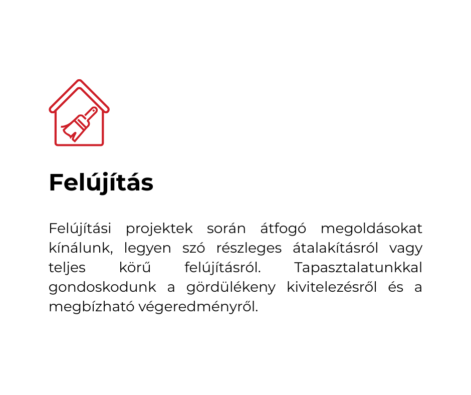 Legyen szó kis-, akár nagy ügyfelekről, mi vagyunk a megfelelő partner építési és felújítási projektedhez! Fordulj hozzánk, szívesen adunk tanácsot, és személyre szabott, egyedi ajánlatot készítünk Neked.
