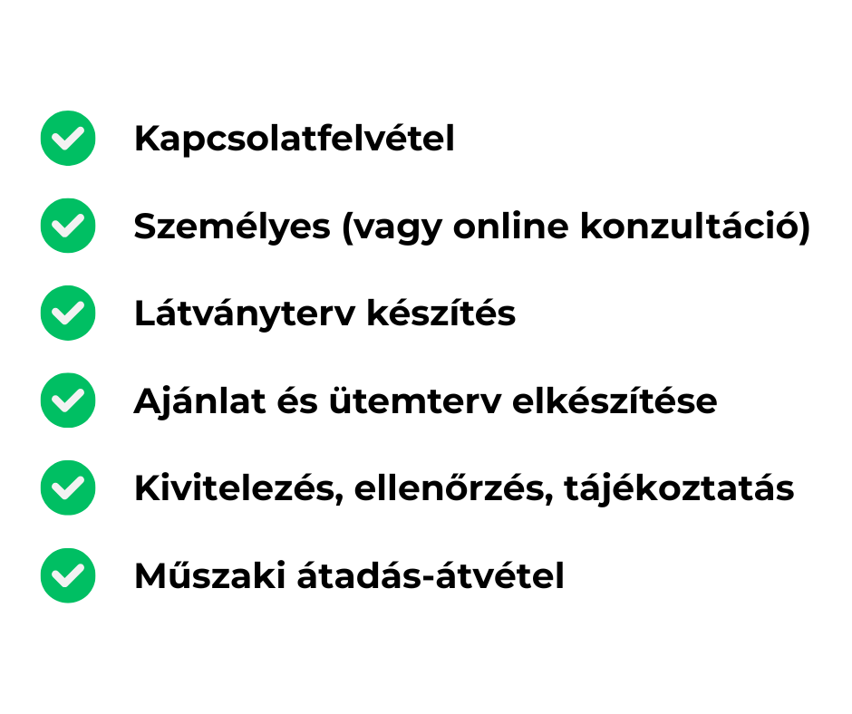 Hiszünk abban, hogy a sikeres projektek alapja a közös gondolkodás és az egyéni igények pontos megértése. Nem eseti megoldásokban gondolkozunk, hanem tudatos tervezéssel valósítjuk meg elképzeléseidet. Ezáltal így zajlik az együttműködésünk folyamata:
